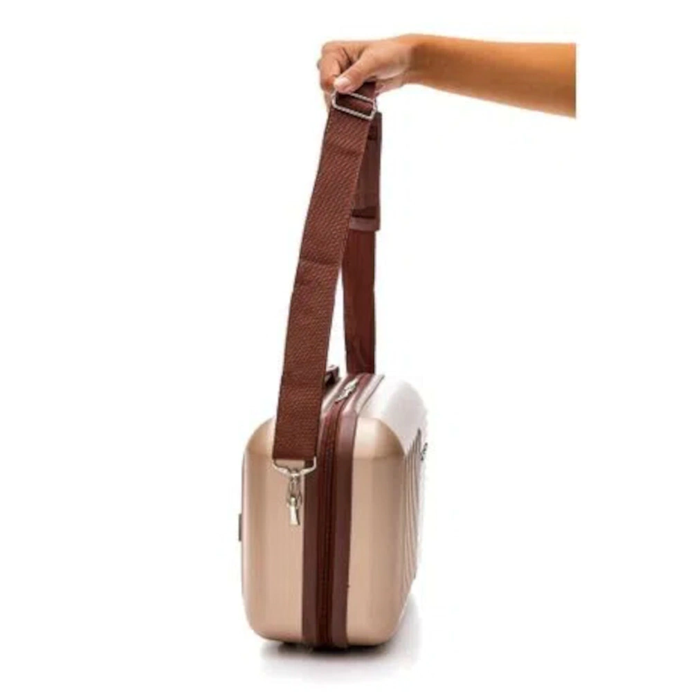 A Frasqueira Polo King Cairo é fabricada em ABS e possui: Na parte interna, amplo compartimento interno, divisor de compartimento, bolso telado com zíper, 3 divisórias em tecido com elástico. Na parte externa, alça de mão emborrachada, alça carona, para inserir a frasqueira na alça da mala, pés de apoio, alça tiracolo, removível e regulável e fechamento em zíper.