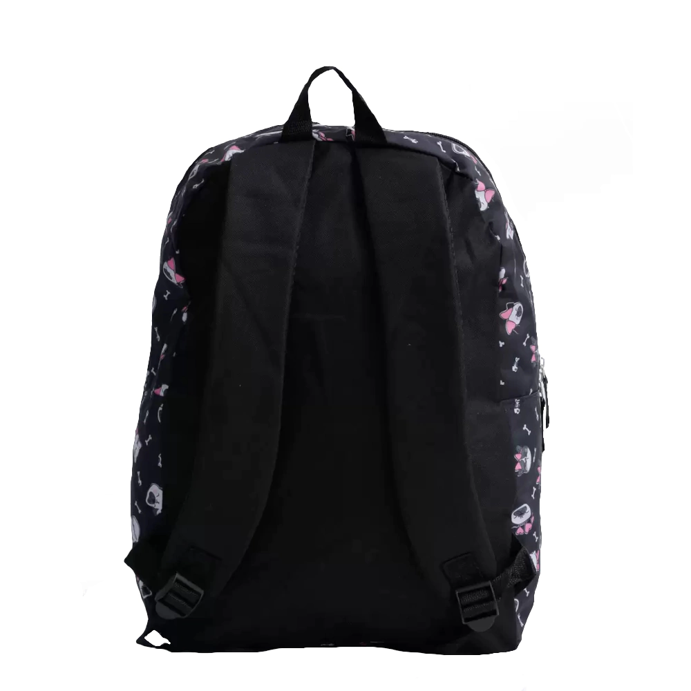 Mochila feminina confeccionada em tecido. Possui estampa pets, fechamento por zíper, repartição única, bolso frontal com zíper, alça de mão, alças nas costas ajustáveis, acabamento e costura no tom.