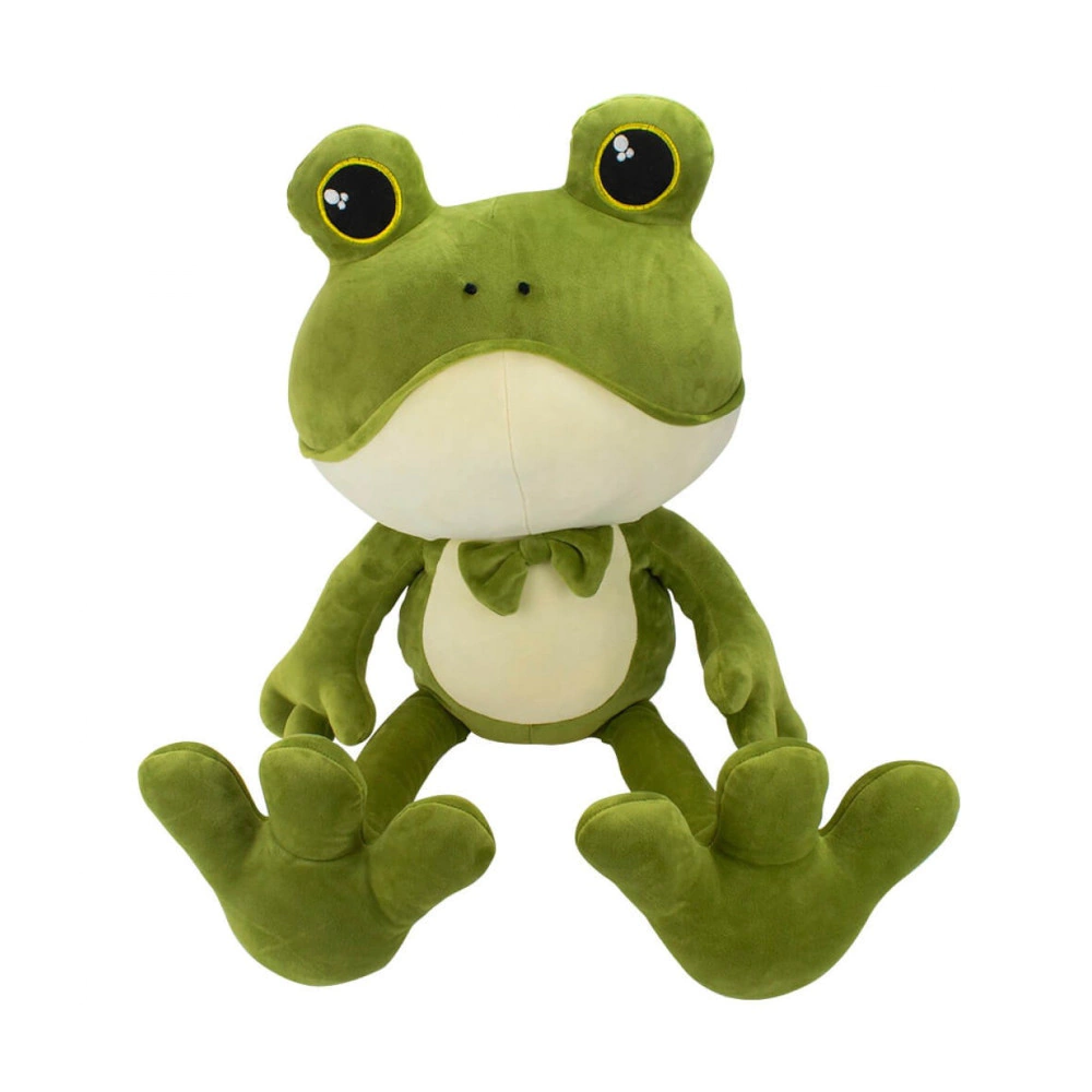 Bichinho de pelúcia no formato de um sapo usando gravata de 40 cm de tamanho (cabeça até ponta da pata estendida). As patas são longas, ideias para colocar o sapo sentado na borda da mesa/estande.
